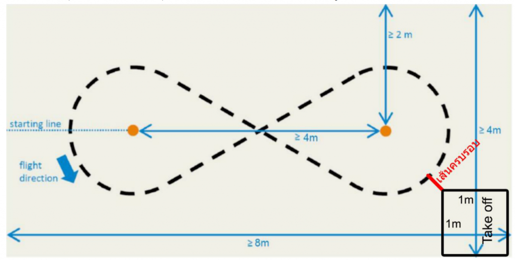 3.3 ผู้เข้าแข่งขันจะต้องบินโดรนตามเส้นทางที่กำหนดอย่างต่อเนื่อง 5 รอบ (โดยไม่ต้องลงจอด)ภายในเวลา 3 นาที โดยกรรมการจะนับรอบเมื่อโดรนบินผ่านจุดที่ Take-off แล้วเท่านั้น และผู้เข้าร่วมแข่งขันกำหนดจุด Take-off เพียงจุดเดียวสำหรับการแข่งขันตลอดระยะเวลาแข่งขัน(3นาที)